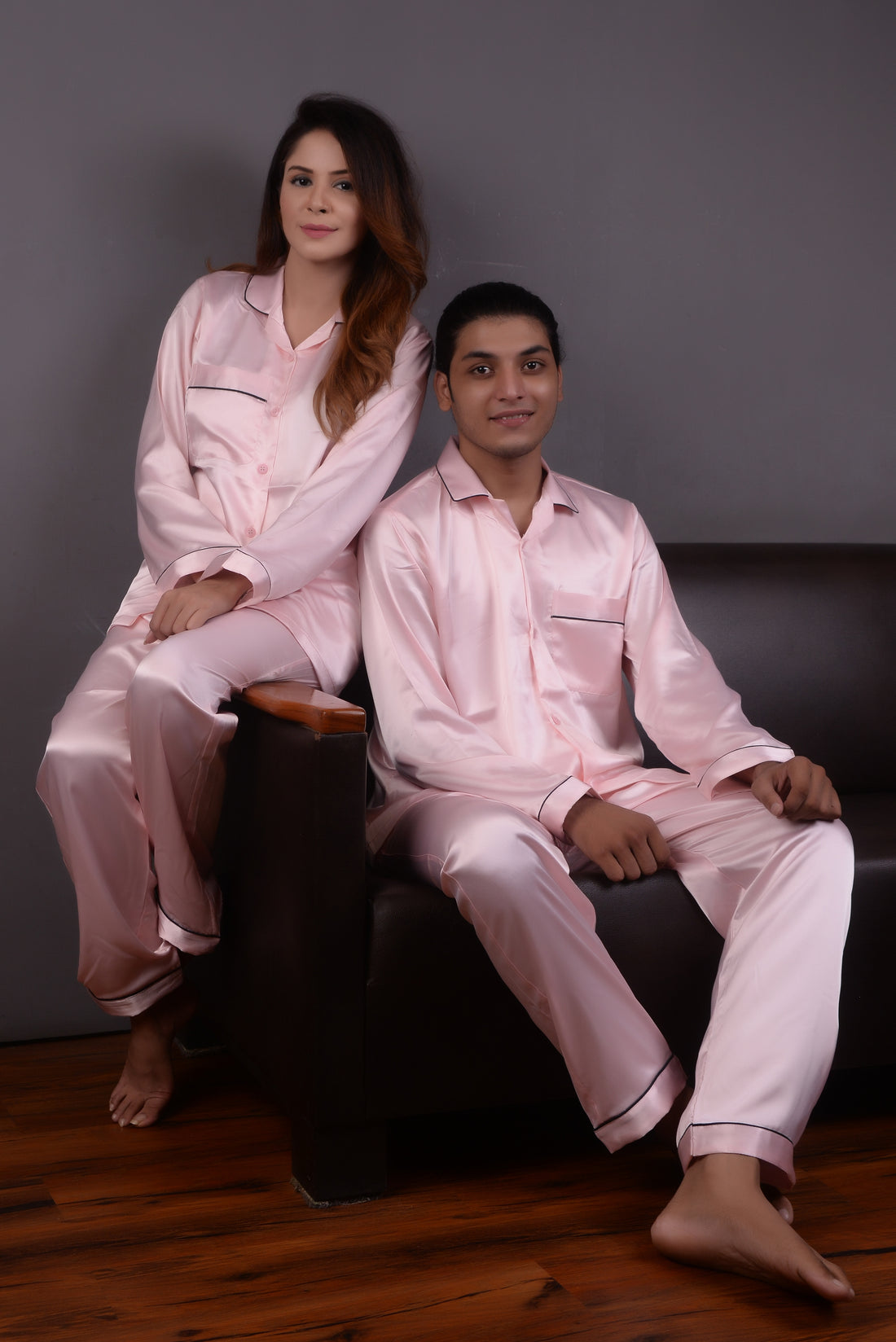 Experience luxury and romance with our Light Pink Silk Couple Nightwear Set. Made in Pakistan...