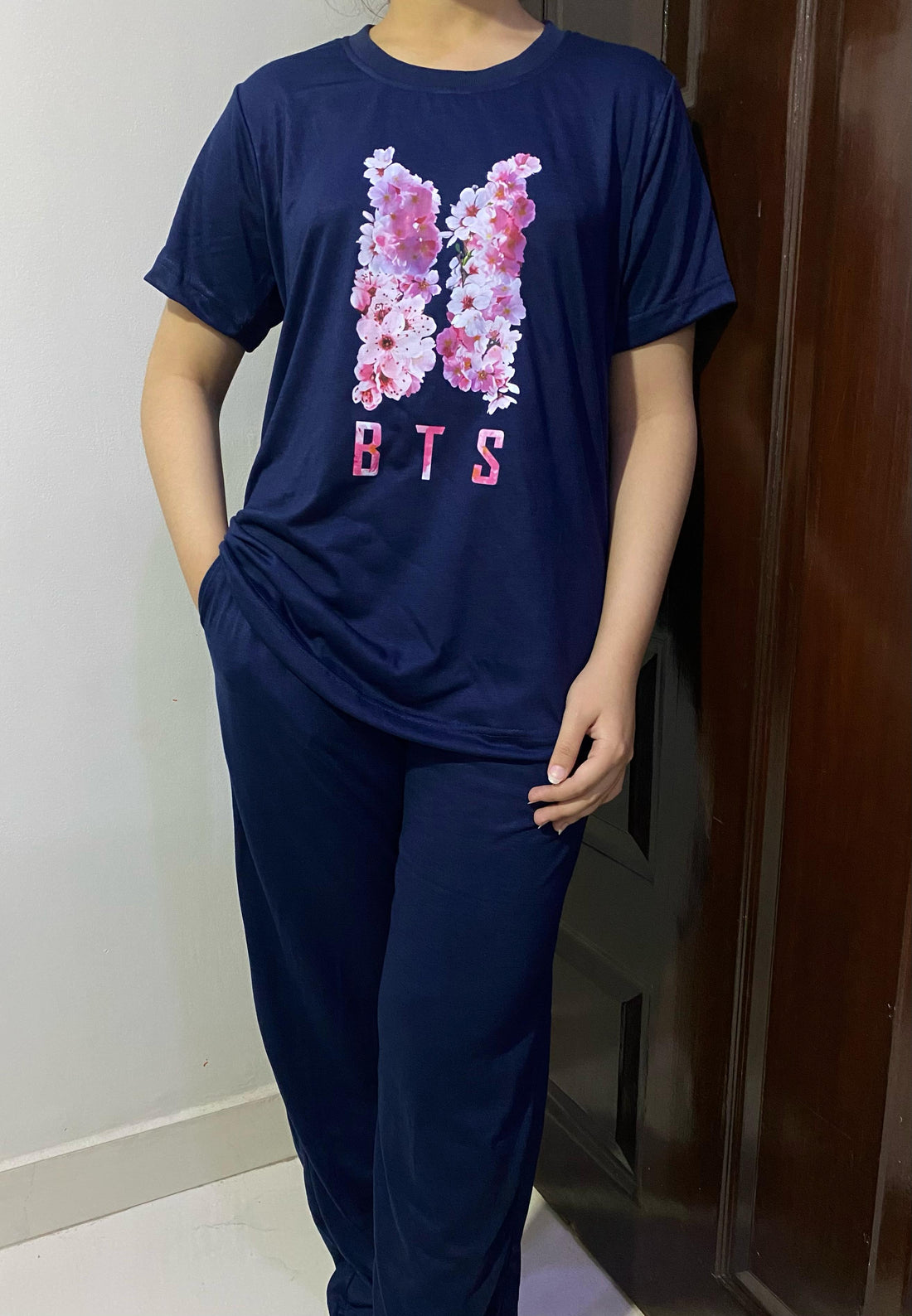 Navy Blue BTS Print T-Shirt Pajama Set For Ladies PJ-05