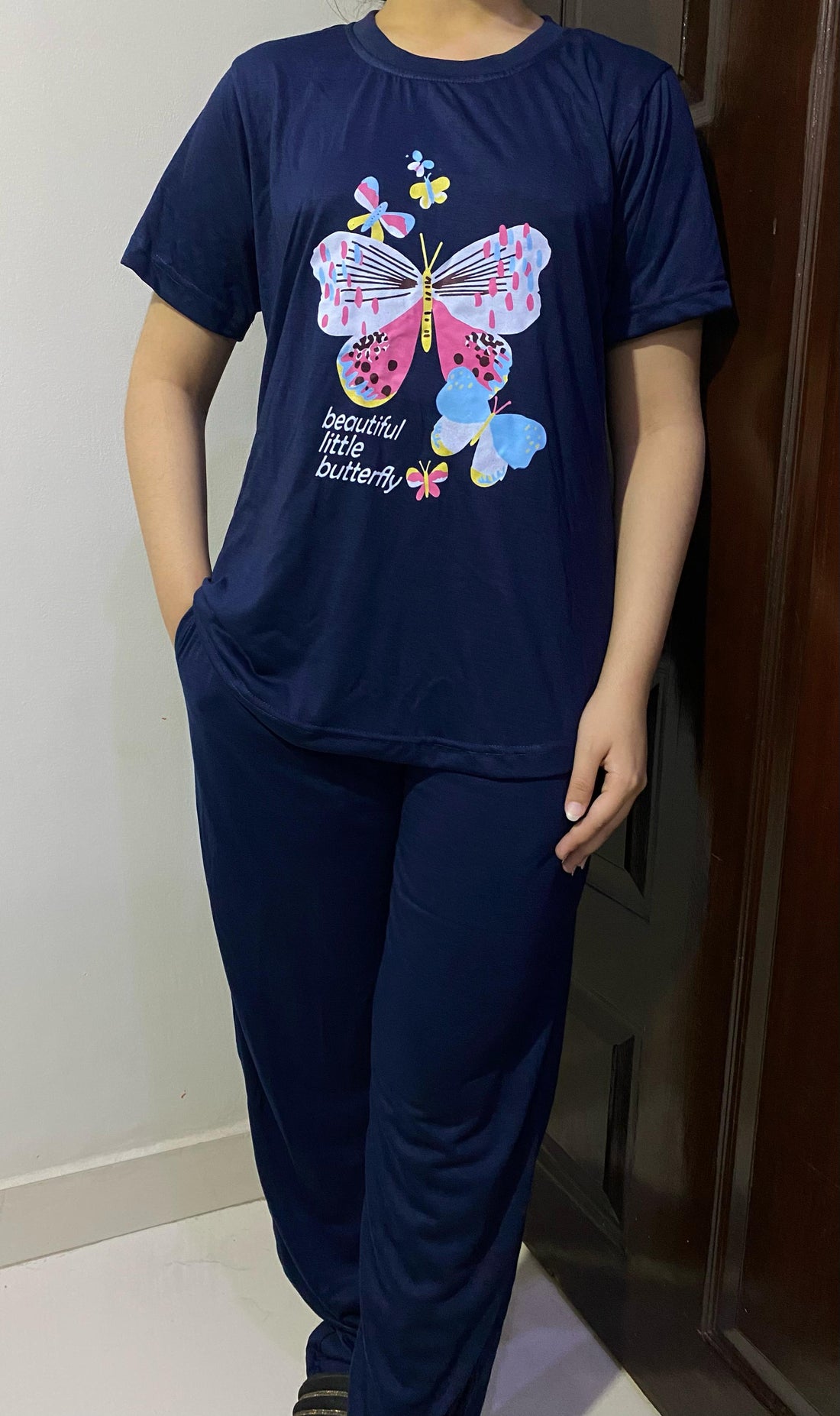 Navy Blue Butterfly Print T-Shirt Pajama Set For Ladies PJ-03