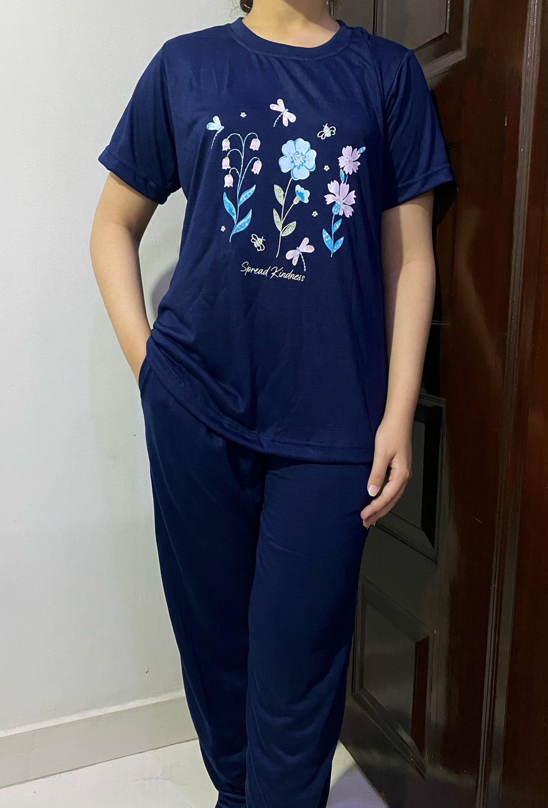 Navy Blue Floral Print T-Shirt & Pajama Set For Ladies PJ-01