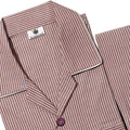 The shirt features long sleeves, a front chest pocket with matching stripe alignment, and a button-fly closure. The pajama comes with an elasticated waistband and a side pocket, offering both comfort and convenience. The elegant maroon base with white stripes adds a classic touch, making it ideal for men who appreciate refined yet relaxed nightwear.