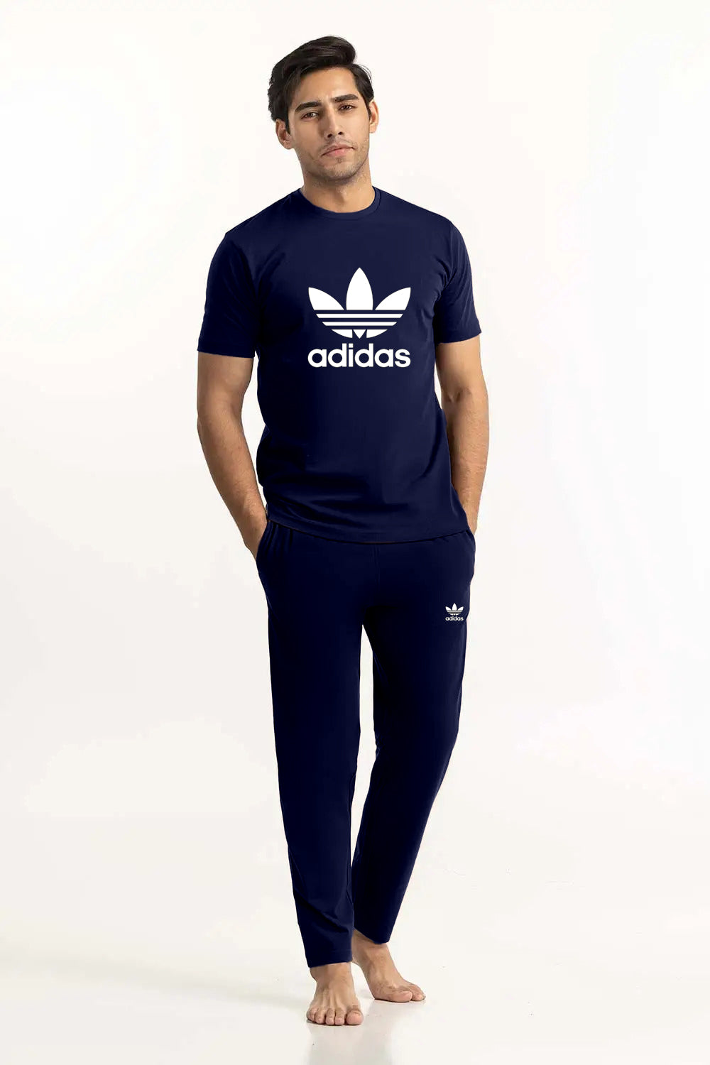 Experience ultimate comfort with our Navy Blue Adidas Jersey Pajama Set for Men. This stylish and breathable sleepwear set includes a plain half-sleeve T-shirt and matching pajama pants designed for all-night comfort. The pajama features side pockets for convenience and an adjustable drawstring waist for a perfect fit. Made from soft and lightweight jersey fabric, this set is perfect for lounging and sleeping.